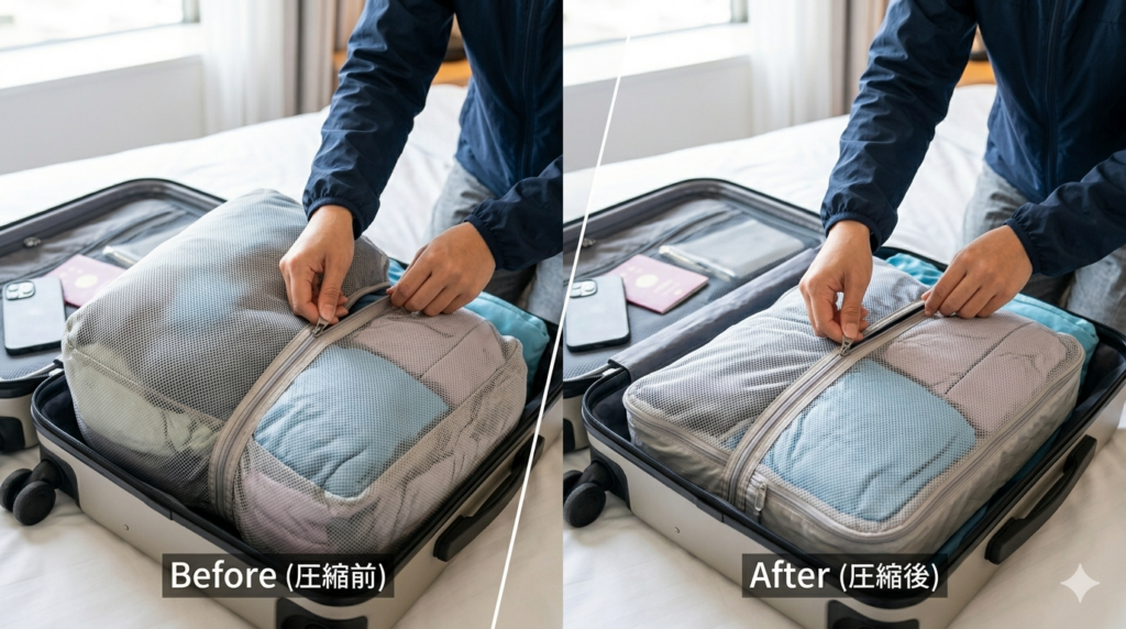 仕分けのコツは、種類ごとにケースへまとめて入れ、薄手のインナーや小型グッズは圧縮タイプのキューブを活用すると、さらにスペースを有効活用できます。また、透明メッシュで中身が見えるタイプなら、何が入っているか一目瞭然で探す手間も省けます。