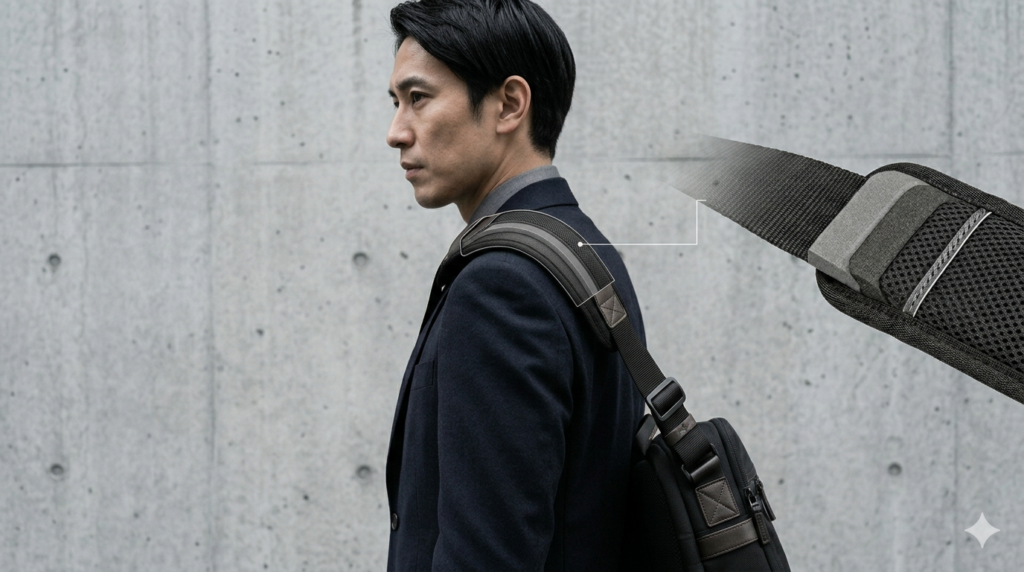 無印良品リュックの大きな魅力は、独自開発されたショルダーベルトの技術です。ベルト外側を厚くし、肩全体で重さを受けることで約40%も負担を軽減する特許技術が活かされています。実際に触ると、ベルト中央の縫い目を境に外側の厚み・弾力性を感じられます。これによりリュックの重量が肩の一点に集中せず、長時間背負っても快適なフィット感が持続します。