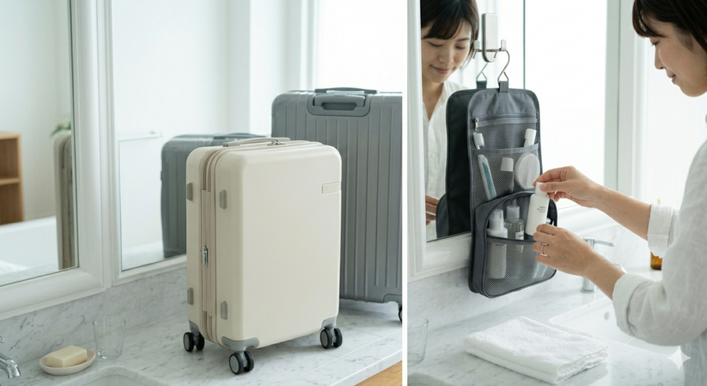 用途別に使い分けできるケースやバッグは、洗面道具・コスメ・充電ケーブルなどを仕分けるのに重宝します。メッシュデザインなら通気性がよく、衛生面でも安心。吊るして使える洗面ポーチはホテルのバスルームや洗面台にもピッタリで、省スペースでの収納・使用が可能です。