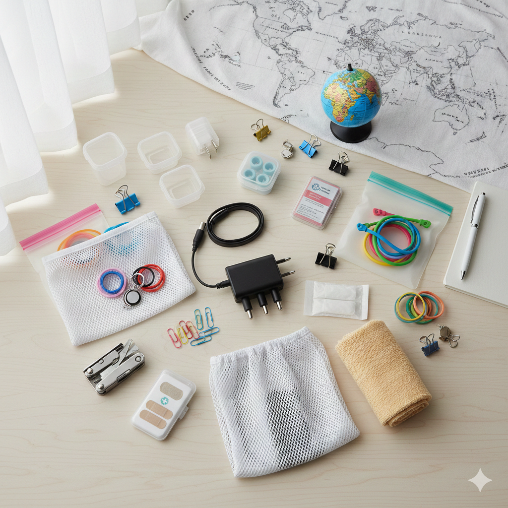 留学生活では、荷物スペースの有効活用が大切です。特に100均の収納グッズや圧縮袋を利用すれば、スーツケース内をすっきり整理し、持参品を効率よく収納できます。現地のコンセントに対応した変換プラグ、洗濯ネット、小型折りたたみ傘なども欠かせないアイテムです。