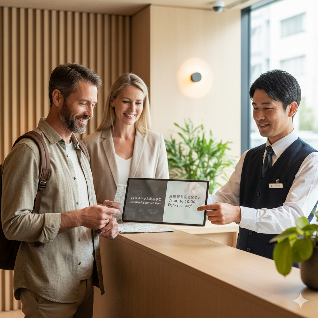 ホテルスタッフの明るい対応と丁寧な英語フレーズで、お客様の滞在がより思い出深いものとなります。